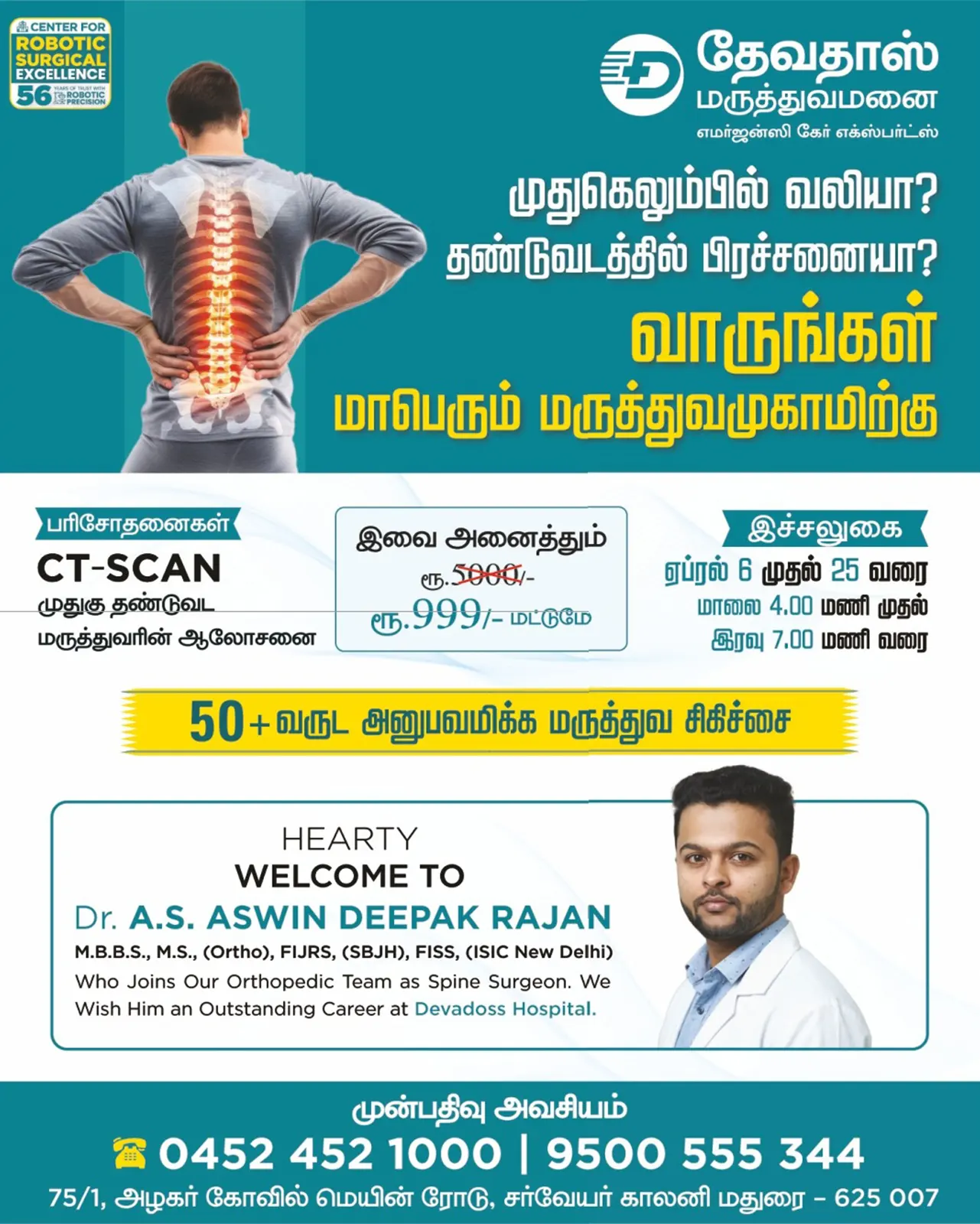 Devadoss Hospital is the best super specialty hospital in Madurai with wide ranging facilities and a dedicated team of doctors. Our Chairman Prof.A.Devadoss is well known in the region practicing Orthopedic surgery for the last 55 years. His vision to provide the best healthcare under one roof has brought about Devadoss Hospital. Devadoss Madurai Hospital has state-of-the-art equipment and technology to diagnose and treat various health conditions.