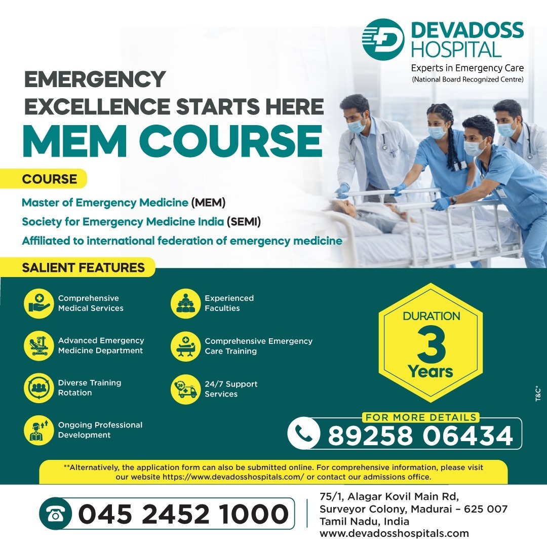 We at Devadoss Hospital is a part of a selected group of institutes which offer the prestigious Diplomate of National Board (DNB) which is a postgraduate medical degree awarded by the National Board of Examinations in Medical Sciences (NBEMS) in India. It is a full-time, 3-year program equivalent to MD/MS degrees.
